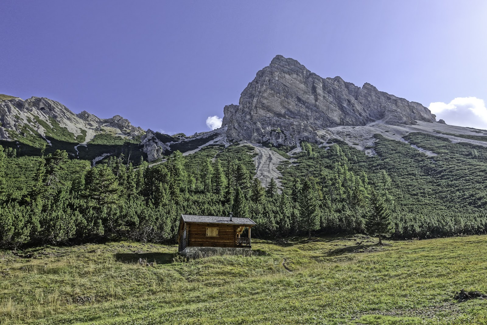 Hike #1: From Le dla Creda to Senes to Pederu and loop back to the start. I'd walked up a steep river canyon before coming to this meadow. I had a snack on the porch of this small locked hut.